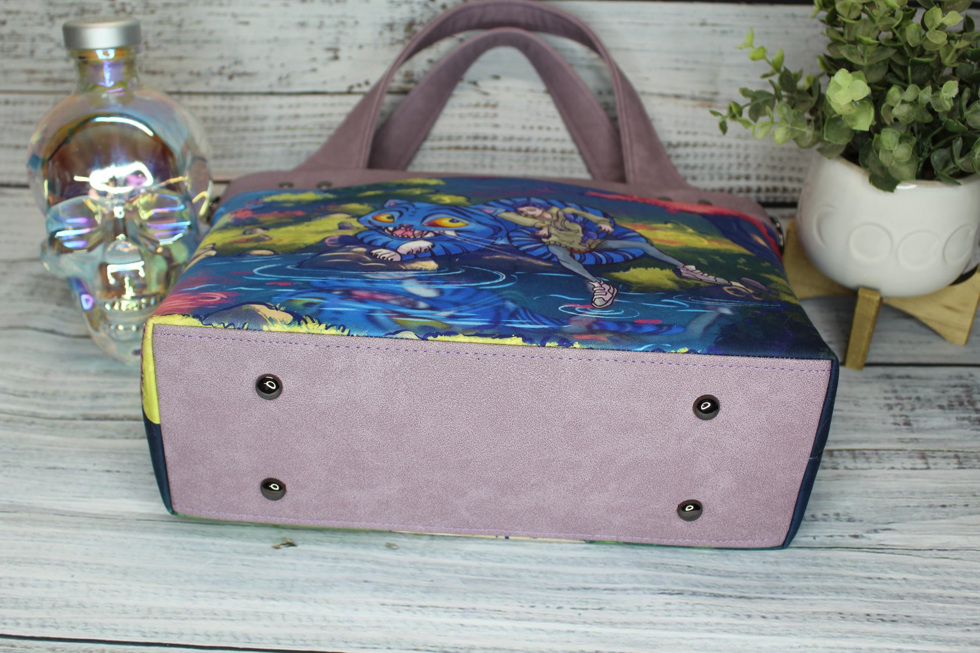 This spacious tote bag has unique handles, a recessed zipper opening, an external cellphone pocket, one internal slip pocket, and one zippered pocket/slip pocket combo. Also includes an optional crossbody strap. Size is approximately 12.5" W x 9” H x 4.5" D Exterior is vinyl and cotton. Interior is cotton.